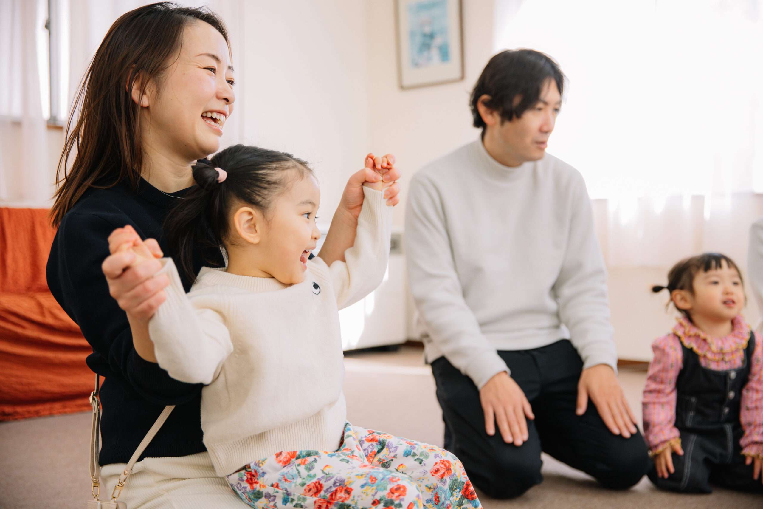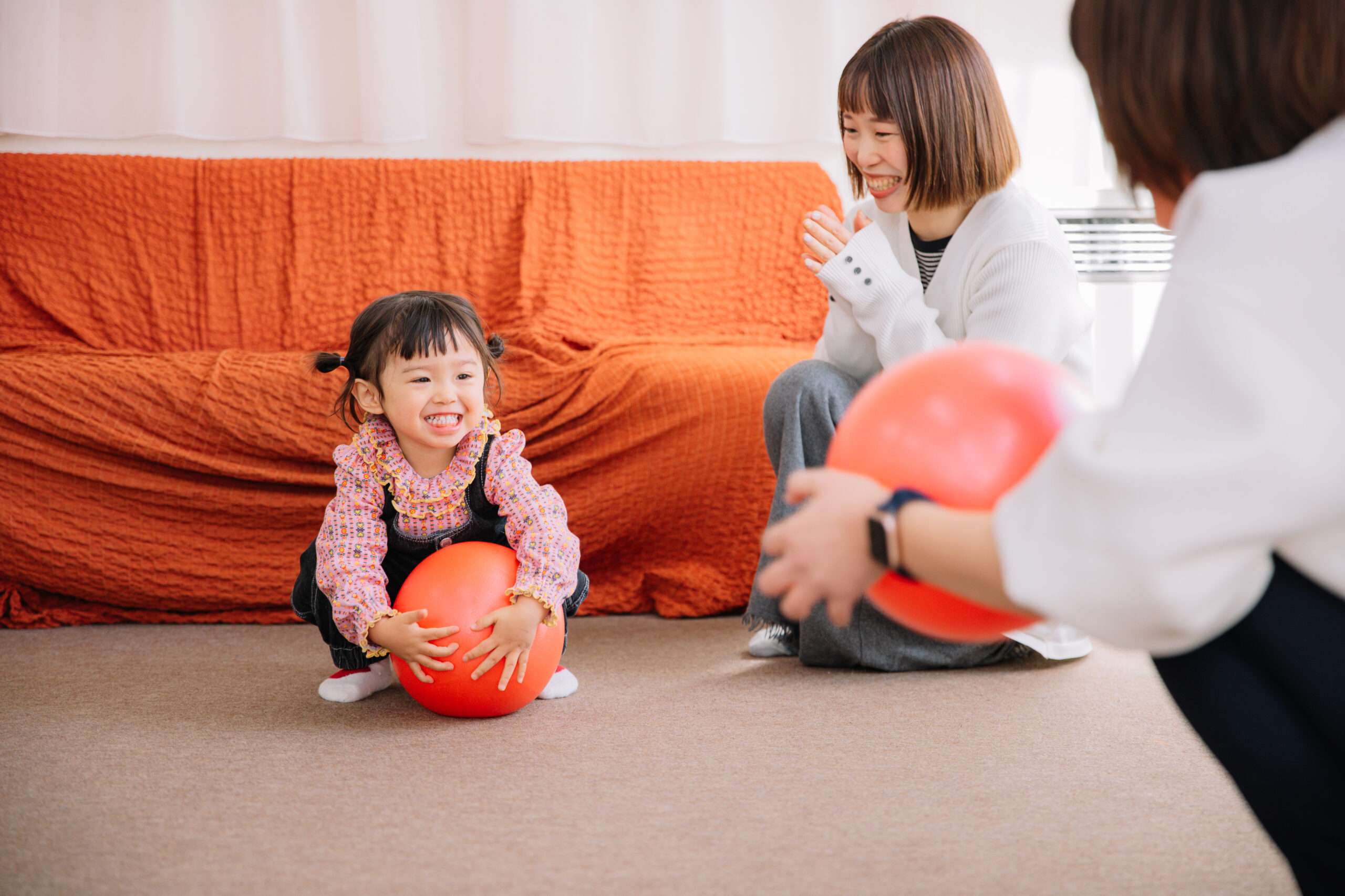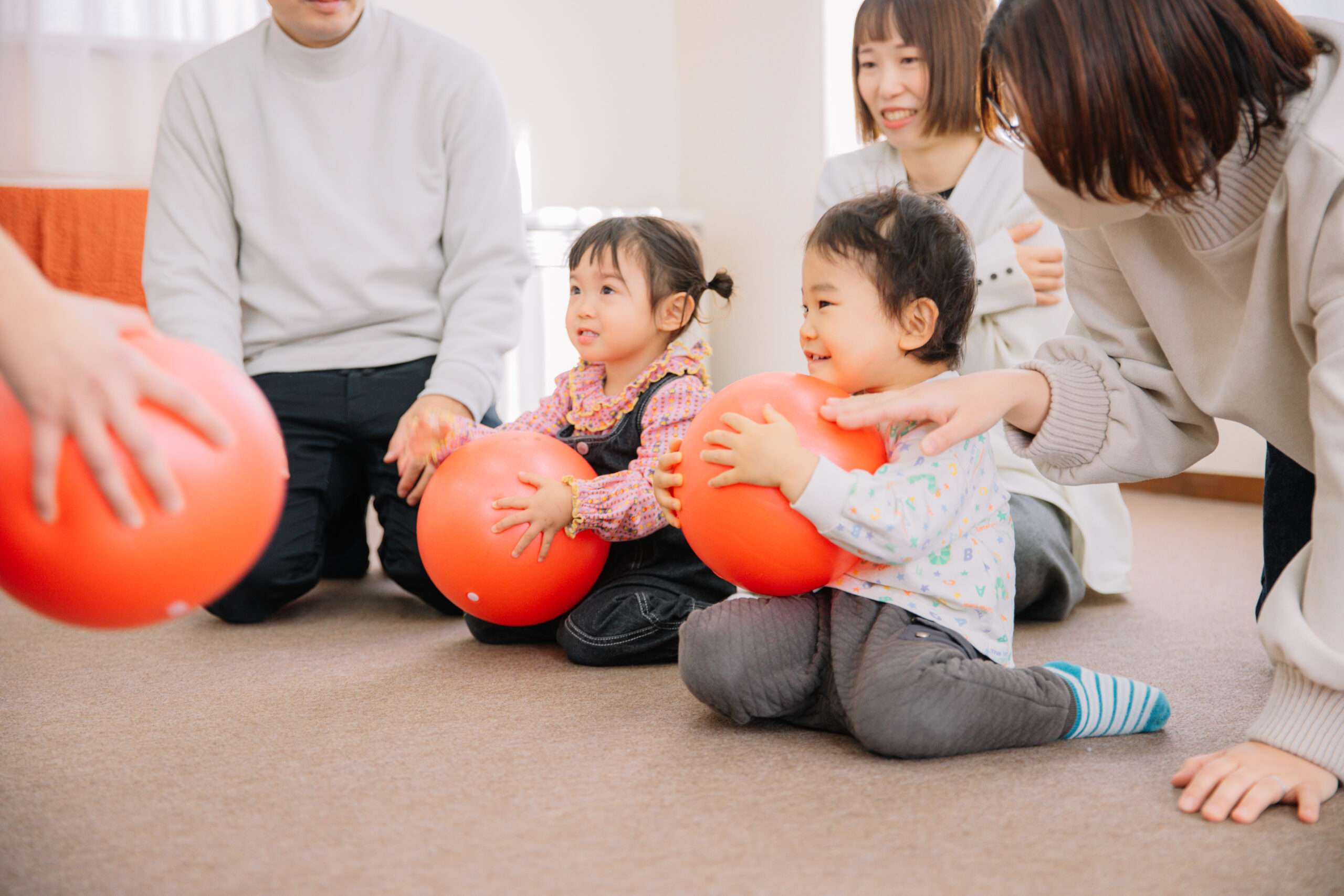 手遊びや、親子で音楽に合わせてボールをはずませたり、お膝でトントンしてもらいながら楽しく聞く力や集中力が身に付きますよ!